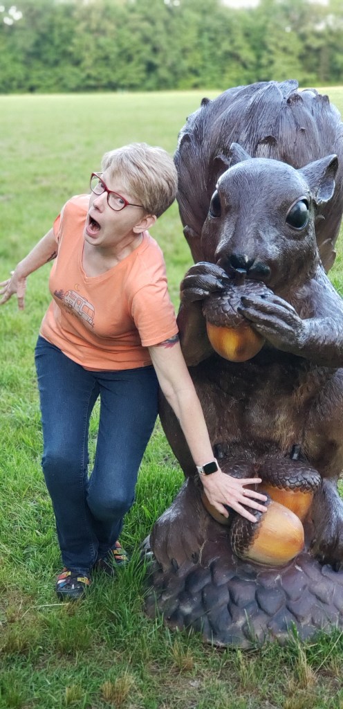 We overnighted at a KOA Holiday in Manchester, TN on our way to Louisville. (It was one of the nicest KOAs we’ve stayed at.) Once we rested a bit we decided to take a walk and discovered a huge field behind the campsites with a walking path around the edge. (A small herd of deer kept an eye on us from the far side of the field.) There are all sorts of interesting “statues” lining the trail and the edge of the woods starting with two gigantic squirrels. Kenn said “Please don’t touch the squirrel’s giant nuts,” so of course I did because that’s how I roll.🤷♀️😂