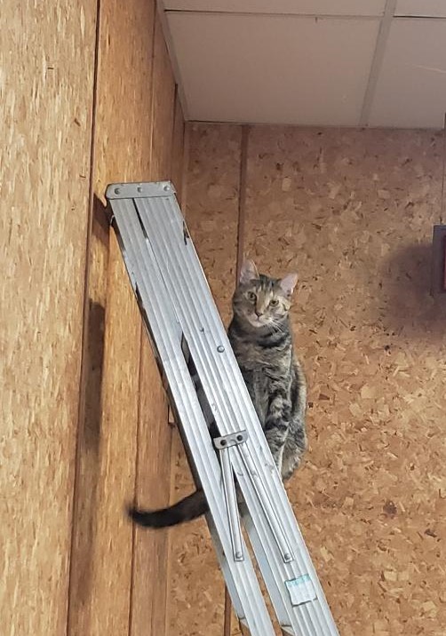 As you can see in the photo, our basement has a drop ceiling; a few days ago, the cats and I heard some sort of critter up there. Kenn brought his ladder in so he could attempt to locate said critter. He didn’t see anything but decided to leave his ladder in the basement until we could have an expert come in and set up traps, etc. I wasn’t sure that leaving the ladder propped against the wall was the best idea. A few minutes later, Tippy proved me right.😂 (Note: we left the ladder in the basement but decided to lay it down.)
