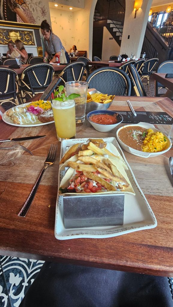 Our last day we ate at Casa Reina Taqueria & Tequila. I had Carne y Papas tacos which is the first time I’ve had fries on a taco. Side note: whenever I see chihuahua cheese on a menu, I have a mental image of herds of chihuahuas hooked up to tiny milking machines. (I’m weird, I know.) I also loved the mural on the dining room wall.