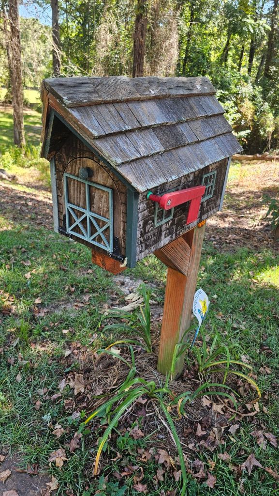 We recently undertook a smaller project. Well, it was a smaller project for me; I don’t think it was even on Kenn’s list. We replaced our mailbox. The Cabin came with a rustic mailbox. (Shocking, I know.) The cedar mailbox was great for our rural location and rustic house, but it required too much upkeep for me. The mailbox looked like a house and the previous owners had stained the sides and roof of the mailbox to match those of The Cabin. They had even painted the “doors and windows” on the mailbox green like those on The Cabin. I played around with the idea of repainting the mailbox “door” yellow after we repainted our front door, but… no. The mailbox roof had faded and needed to be restained; it also had moss and lichen growing on it. I mentioned it to Kenn, and he was enthusiastic. “We can clean it and restain it!” However, I strongly suspected that that “we” meant “me” and “me” had no interest in taking on that task. I’m not a high-maintenance person, and I don’t want a high-maintenance mailbox. So, I bought a basic bronze mailbox and we installed it a few days ago.