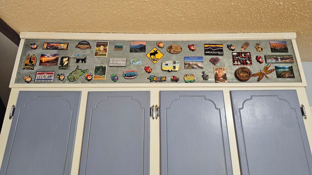 We were unaware of Roxie’s kleptomaniac tendencies until we returned from our 2023 road trip only to discover most of my refrigerator magnets missing. At the time of our trip, Roxie was somewhere between six and seven months old. I still don’t know how a kitten was able to remove so many magnets; I’m guessing sheer determination played a large role. Most of my magnets are souvenirs from our travels, so I didn’t want to just not get any more, but a different solution for protecting them was needed. Fortunately, an idea presented itself.