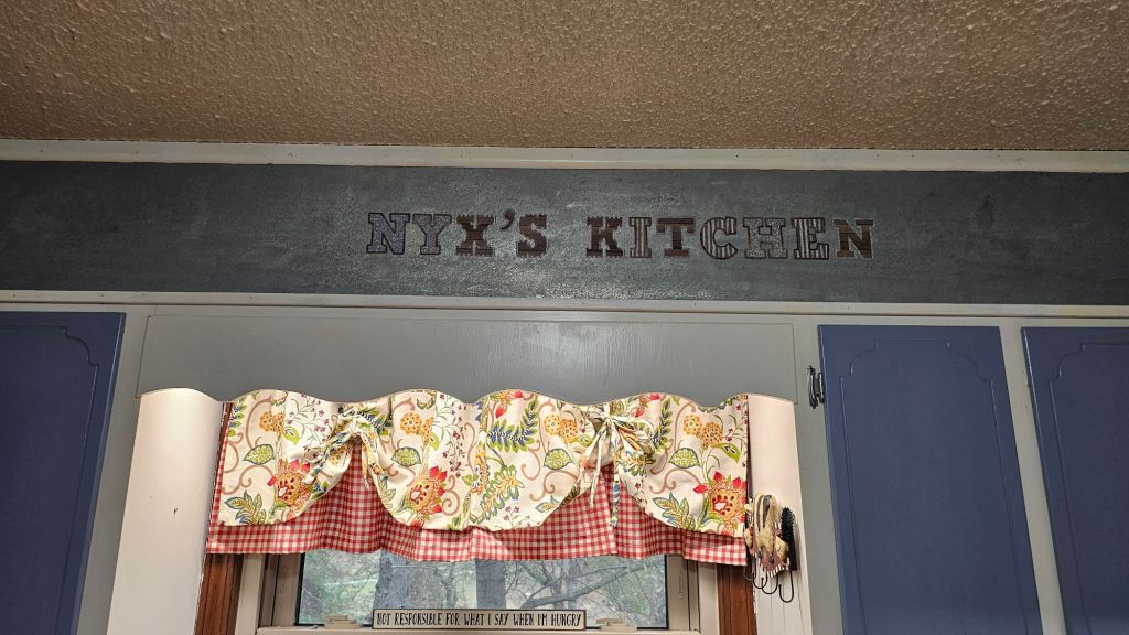 We both like the looks of the metal so Kenn decided to continue it across the remaining cabinets. We joked that we need to put up a sign saying “Nyx’s Kitchen” since the kitchen is very much Nyx’s (our black cat) “territory.” I found some rustic-style letter magnets and voila!