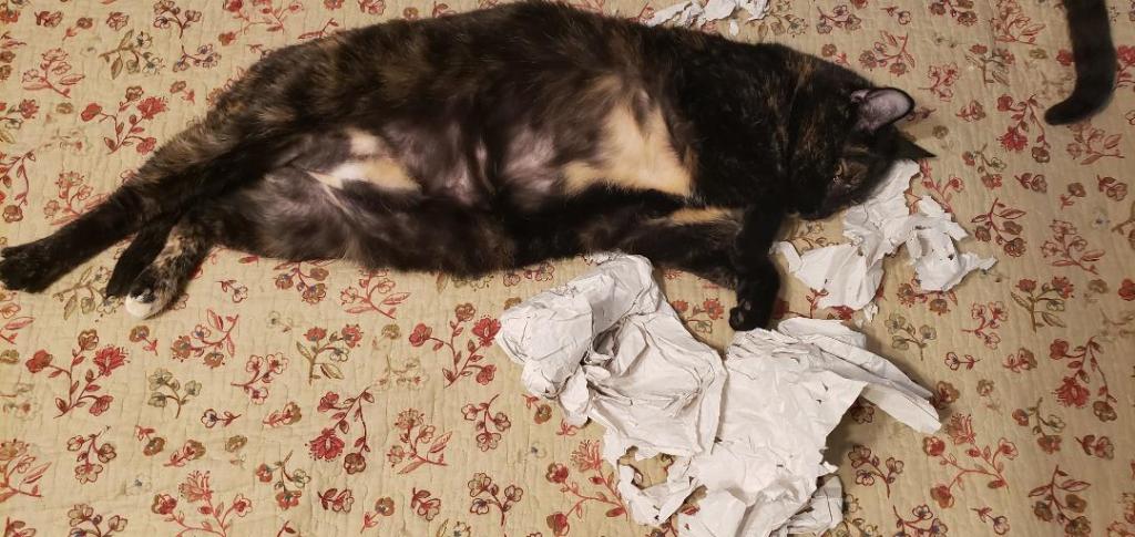 When Cricket was a kitten we had to hide the toilet paper in all bathrooms because any roll left out would get shredded within an inch of its life. She eventually outgrew that particular obsession, but even now, as a senior kitty, occasionally the old urges return. Here, she is sleeping the sleep of the righteous after destroying the paper that was in the box with my new work boots.